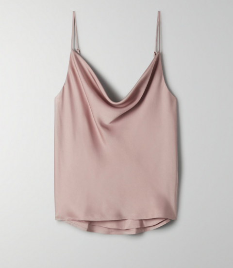 This is a draped cowl-neck camisole with adjustable straps. It's made of a luxurious satin fabric with a gloss finish.